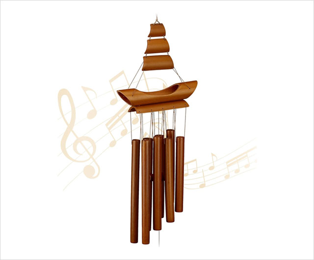 ★★★★★ Relaxdays Windspiel Bambus, Klangspiel Segelboot-Design, Hängedeko draußen & drinnen, HBT: 72x20x6 cm, Windorgel, braun.